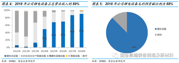 现阶段锂电设备成为公司业绩增长的主要驱动力。公司产品应用于锂电池、光伏、3C检测、燃料电池等多个下游,受益于下游电池厂商技术的快速迭代与大幅扩产,锂电设备已成为公司的业绩贡献主力,营业收入占比从2011年的6%提升至2018年的89%;2018年毛利润贡献率为88%。