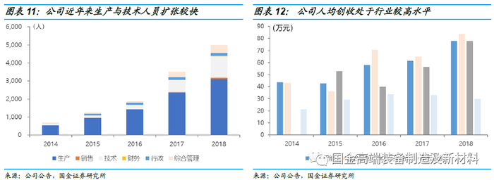 近年来,为了满足下游锂电池厂商快速扩张的需求,公司在工作人员上进行大幅扩张,尤其是生产与技术人员增长加快,整体员工数量从2014年的704人扩大至2018年4994人。人员扩张快速的原因主要是公司所制造的设备属于非标自动化产品,此类产品核心的程序是根据客户需求进行设计方案、部件选型、参数验证、现场调试等,产能的体现主要在于工程师与安装工人。公司扩张人员规模与效率提升并重,人均创收持续攀升,2018年人均创收约为78万元,处于行业较高水平。