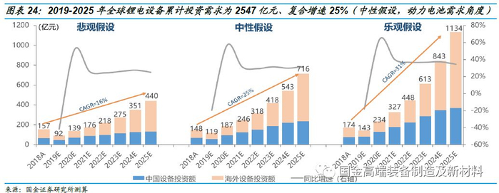 需求空间广阔。2019-2025年全球动力电池需求对应锂电设备累计投资额为2547亿元,中国、海外分别为1072亿元、1475亿元;从电池厂扩产规划看,现有扩产计划对应2019-2025年共1981亿元设备投资。