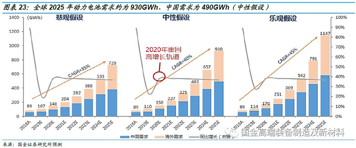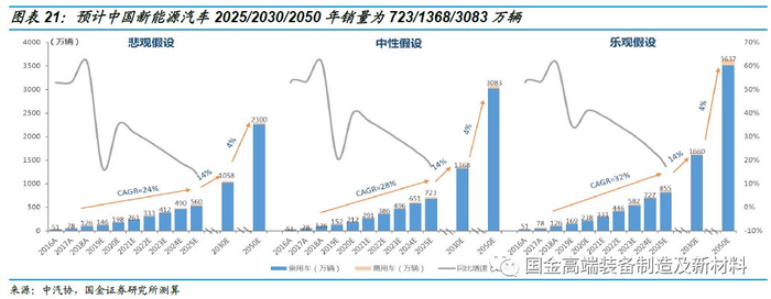 1)电池端:①单车带电量:在电池技术进步下有望不断提升,以乘用车为例,预计由2018年约31KWh提升至65KWh(2025E);②新能源汽车销量:中性假设下,预计中国19-25年销量复合增速约30%,2025年销量为723万辆;全球19-25年销量复合增速约32%,2025年销量1400万辆。