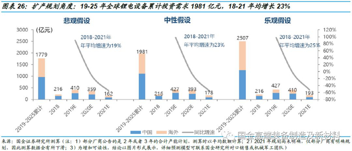 ②我们判断,行业处于上行周期,2019年扩产规划相对确定,设备采购需求同比增加约91%;考虑项目建设分阶段及短期新能源汽车退补影响,实际投资预计平滑,2018至2021年年均增长率约为23%;