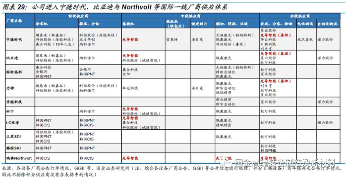 公司已进入国际一线电池厂商供货体系,未来将获取更多全球需求红利。凭借技术积累、规模效应与交付期较短等优势,公司在维持与宁德时代、比亚迪等国内龙头电池厂商的深度合作下,已建立起与松下、LG化学、瑞典Northvolt等国际一线电池厂商的战略合作关系,进入各大厂商供货体系以获取海外投资需求红利。此外,海外电池龙头对生产线的高要求将反向推动上游设备厂技术进步,形成更高的进入壁垒。