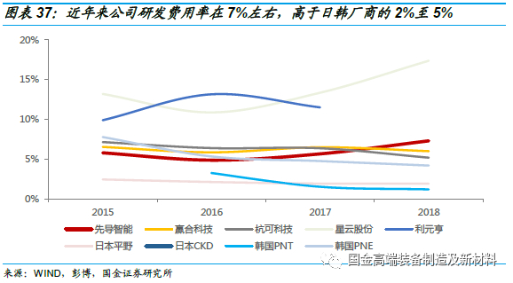 公司近年来的研发费用率维持在7%左右,高于日韩设备厂商的2%至5%;2019年上半年,公司继续加大研发投入,研发费用率上升至11%。我们认为,目前锂电设备正处于迭代较快的阶段,加大研发投入、前瞻布局新技术将不断促进公司超越相对成熟的日韩设备厂商,获取更多全球需求红利。