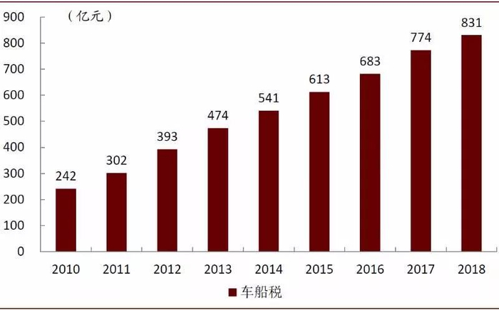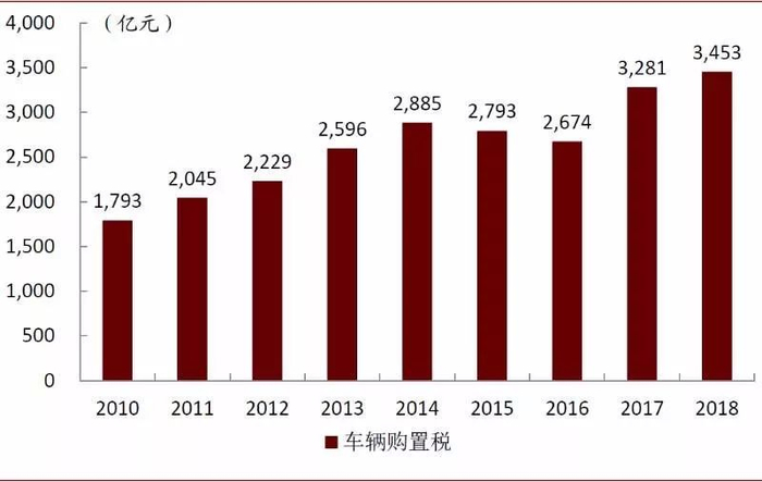 我们估算汽车行业四大税种中,地税占比约17%。目前中国汽车产业链的税种主要有消费税、增值税、购置税和车船税,其中消费税和购置税为国税,增值税为中央和地方共享税(国税75%、地税25%),仅有车船税为地税。根据统计和我们的测算(消费税没有单独披露汽车行业数据),2018年汽车行业四大税种的税收收入分别为3453亿元、1227亿元、1192亿元和831亿元,地税占比仅为17%。