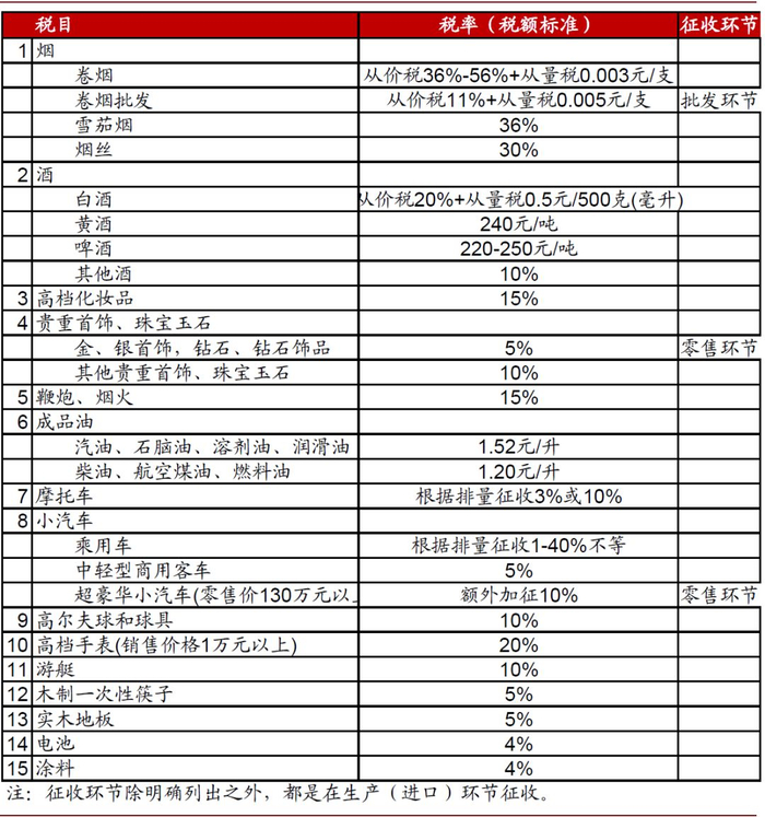 此次消费税的改革主要包括两方面:一是征收环节后移,将部分在生产(进口)环节征收的现行消费税品目逐步后移至批发或零售环节征收。二是稳步下划地方,拓展地方收入来源,增量部分原则上将归属地方。