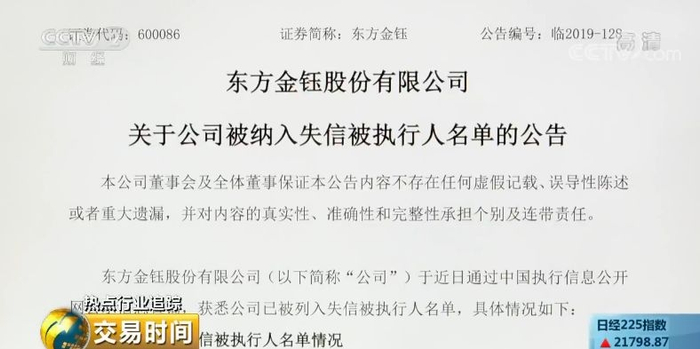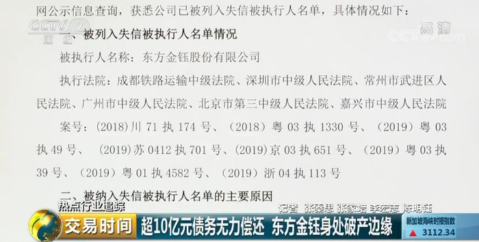 市值风云大数据部负责人 顾左右:因为东方金钰在北京、广州、成都等六家法院都有败诉的诉讼,目前诉讼层面上的一共是十个多亿。因为这十个多亿的债务无力偿还,所以被列为了失信人。