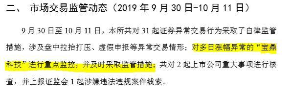 10月11日,深交所披露监管动态,9 月 30 日至 10 月 11 日,深交所共对 31 起证券异常交易行为采取了自律监管措施,涉及盘中拉抬打压、虚假申报等异常交易情形;对多日涨幅异常的“宝鼎科技”进行重点监控,并及时采取监管措施。