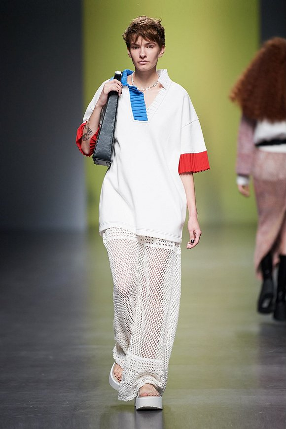 不同面料的裁剪拼接则为整个系列带来视觉上的心意。在裙子一侧直接裁开的叉口为双腿提供更多摆动空间的同时,也让服饰在不同角度获得别致的欣赏效果;宽松卫衣和轻薄纱网的拼接流露出春夏季节悠闲感受;一件点缀着缤纷花朵图案的背心与纯白衬衫和裤装模样短裙搭配,是主人随时前往乡村度假时的穿衣首选。