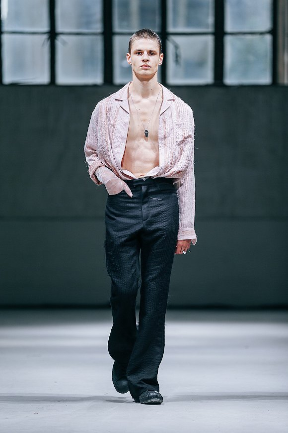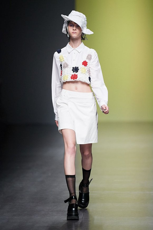 服装上的细节是手工完成,飞散的毛边呼应了主题,可以被视作情感中的“瑕疵”和性格中的弱点。秀场上模特造型中的配饰为首饰品牌COUGH IN VAIN。
