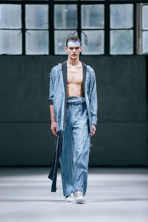 此次在主题为“EUPHORIA”的2020春夏系列中,设计师刘丹霞(Dan)和黄善鹏(Shan)想要体现男性处于悲伤或柔弱时刻中的美。因此他们选择了有垂坠感的真丝面料、缎面和雪纺作为主要材质,视觉上更为柔和,同时也保证了服装的舒适度。色彩也选择了较为中性化的颜色,例如淡蓝和粉色。