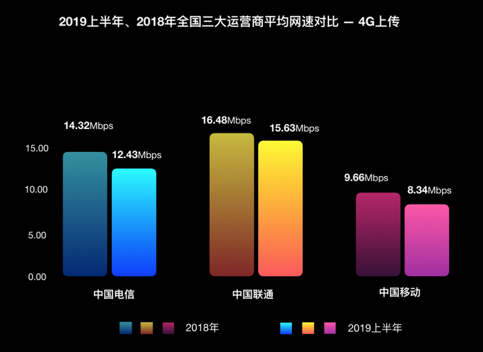 Speedtest在这份报告中指出,今年上半年4G网络平均下载速度和平均上传速度最高的都是中国联通,分别达到30.11Mbps和15.63Mbps。平均下载速度和上传速度排名第二的是中国电信,分别为20.24Mbps和12.43Mbps;平均下载速度和上传速度排名第三的是中国移动,分别为20.03Mbps和8.34Mbps。