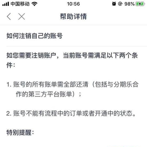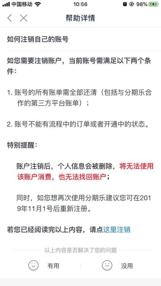 《每日经济新闻》记者以上述案例提到的分期乐为例进行试注销,分期乐APP界面显示:如果用户需要注销账户,拟被注销账号需满足“账号的所有账单需全部还清(包括与分期乐合作的第三方平台账单)”“账号不能有流程中的订单或者开通中的状态”两个条件。账户注销后,个人信息会被删除,将无法使用该账户消费,也无法找回账户。