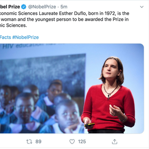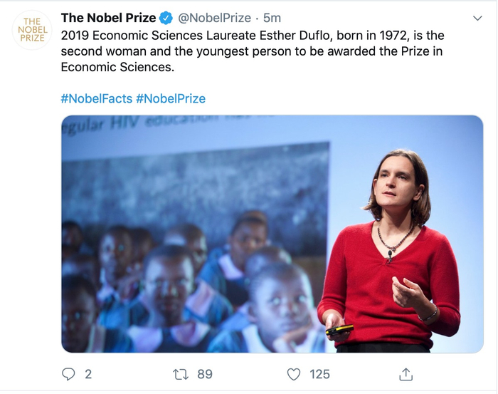 法国经济学家Esther Duflo生于1972年,是最年轻的诺贝尔经济学奖得主,也是第二位诺贝尔经济学奖女性得主。诺贝尔奖推特截图