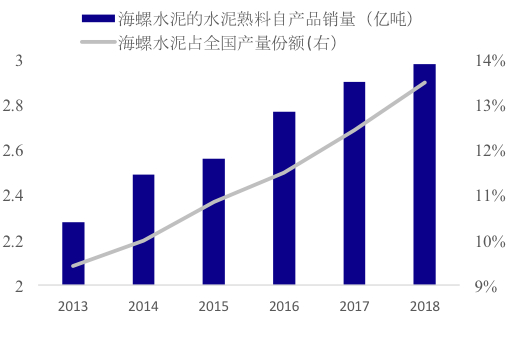 周期品方面,海螺水泥销量占水泥行业全国产量比重从2013年的9.4%升至2018年的13.5%。