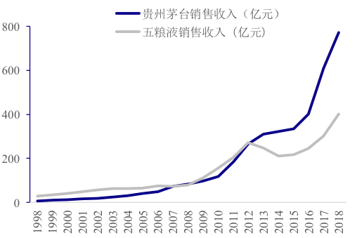 贵州茅台成功的品牌经营使其拥有白酒中最高的投资价值,其营业收入超过五粮液且差距逐渐拉大。