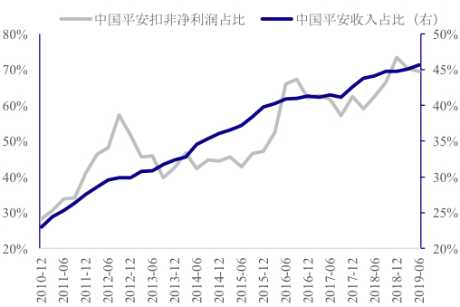 金融行业看,保险龙头中国平安的盈利和营业收入在A股上市保险公司中的份额持续提升,盈利占比从2010年的约30%升至2018年的约70%。