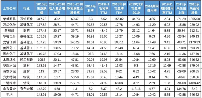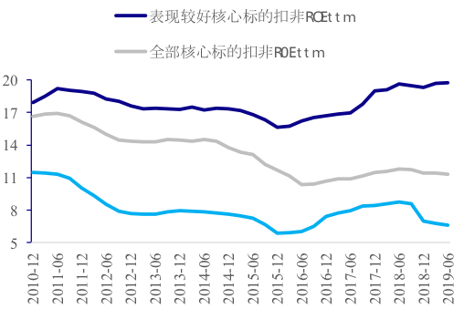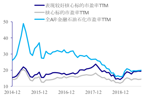 2015年以来,表现较好的核心标的的市盈率从约15倍升至19倍,全部核心标的的市盈率仍维持在14倍,全A非金融石油石化上市公司的市盈率从26倍降至20倍。