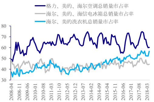 白电行业方面,空调行业格力、美的、海尔三大头部公司的市场份额近10年来维持在60%以上的高位。冰箱行业的海尔、美的、海信市场份额保持在45%左右。洗衣机行业的海尔和美的市场份额从2008年的35%左右升至目前的55%左右。