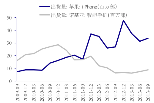 2011年苹果取代诺基亚成为手机行业龙头,黑莓、HTC等多个品牌手机品牌销量较高峰显著下滑。