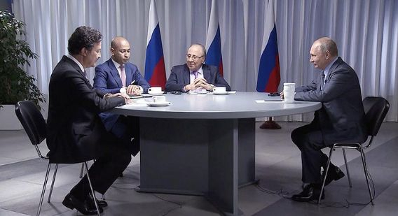 普京(右)12日在访问沙特阿拉伯前接受媒体采访,图自克里姆林宫官网