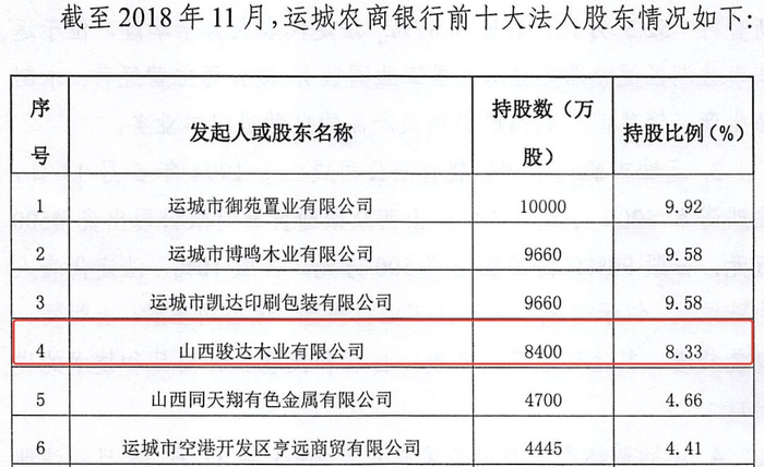 2018年12月11日,山西运城农商行发行2019年度同业存单发行计划显示,山西骏达木业持有山西运城农商行8400万股,持股比例8.33%,是该农商行持股5%以上的4家股东之一。