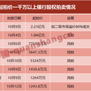 今年10月以来,银行股权司法拍卖不断,据券商中国记者统计,起拍价在1000万元以上的银行股权拍卖有8宗。