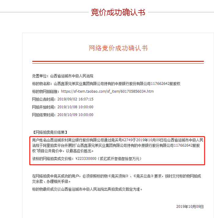 阿里司法平台显示,10月9日中原银行上述1.18亿股权拍卖,持有人为鑫源兄弟集团,成交价为2.23亿元——也是起拍价,由山西运城农商行竞拍到。