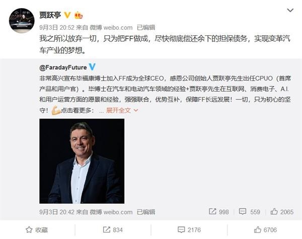 贾跃亭最新一条微博仍停留在9月3日,“我之所以放弃一切,只为把FF做成,尽快彻底偿还余下的担保债务,实现变革汽车产业的梦想。”