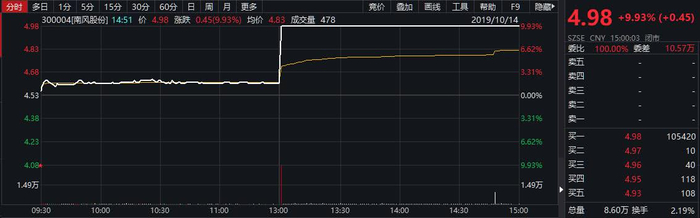 10月14日午后,南风股份(300004.SZ)直线拉升封住涨停,报每股4.98元,对应市值23.9亿元。涨停原因在于当日午间南风股份的一份权益变动公告。