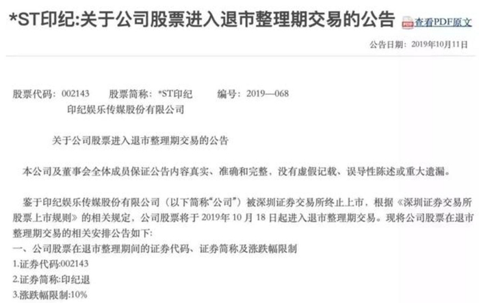 10月10日,深交所对外发布公告,由于印纪传媒股票连续二十个交易日的每日收盘价均低于股票面值(1元),决定印纪传媒股票终止上市,并自2019年10月18日起进入退市整理期,退市整理期为30个交易日,退市整理期届满的次一交易日,印纪传媒股票正式摘牌。