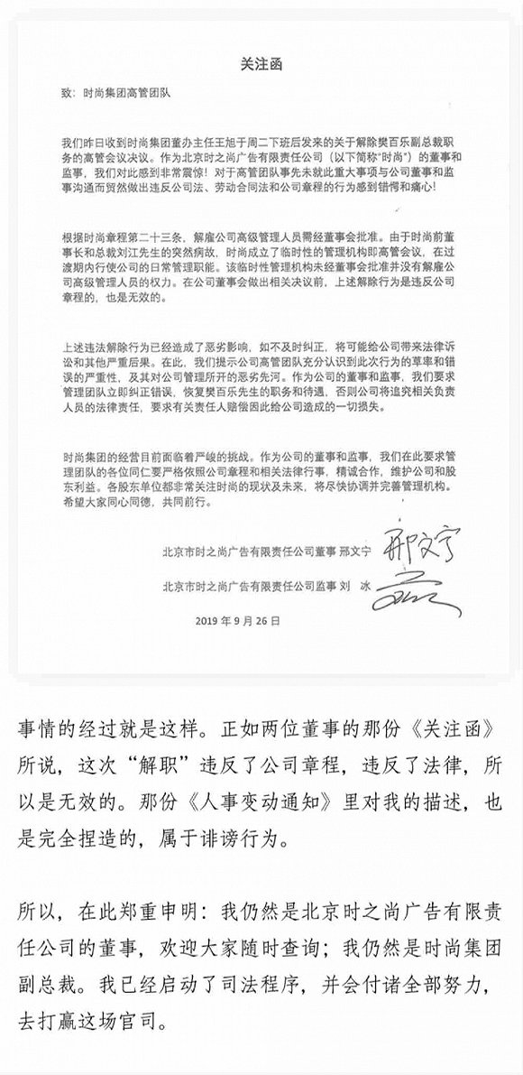 他同时特别感谢了时尚集团的董事邢文宁先生(代表股东美国赫斯特传媒集团)和监事刘冰先生(代表股东IDG)的正义感。此前,三声披露了由邢文宁和刘冰发出的《关注函》。该关注函指出这场针对樊百乐的卸职行动“是无效的”。他们选择站在了樊百乐一边。