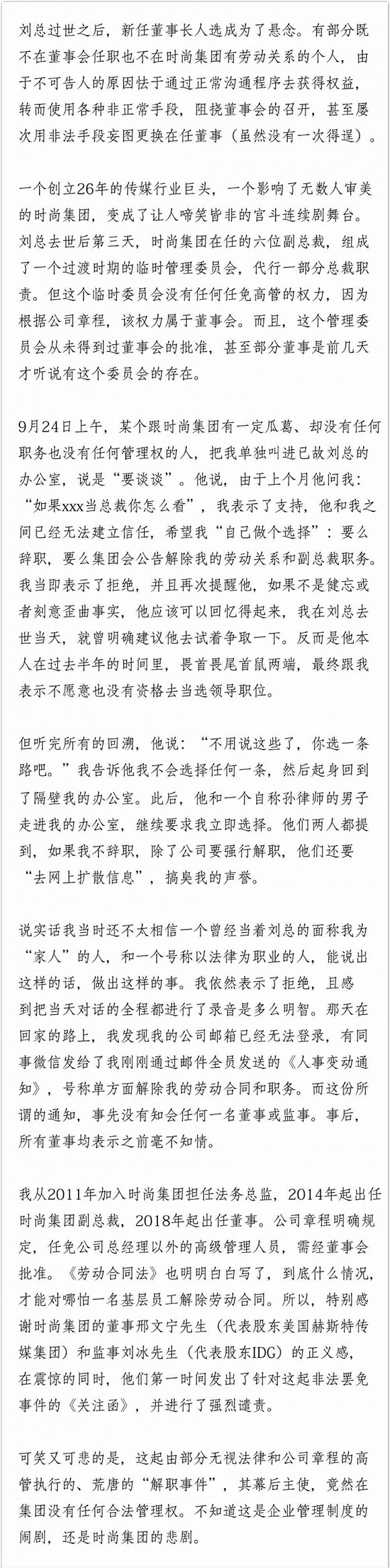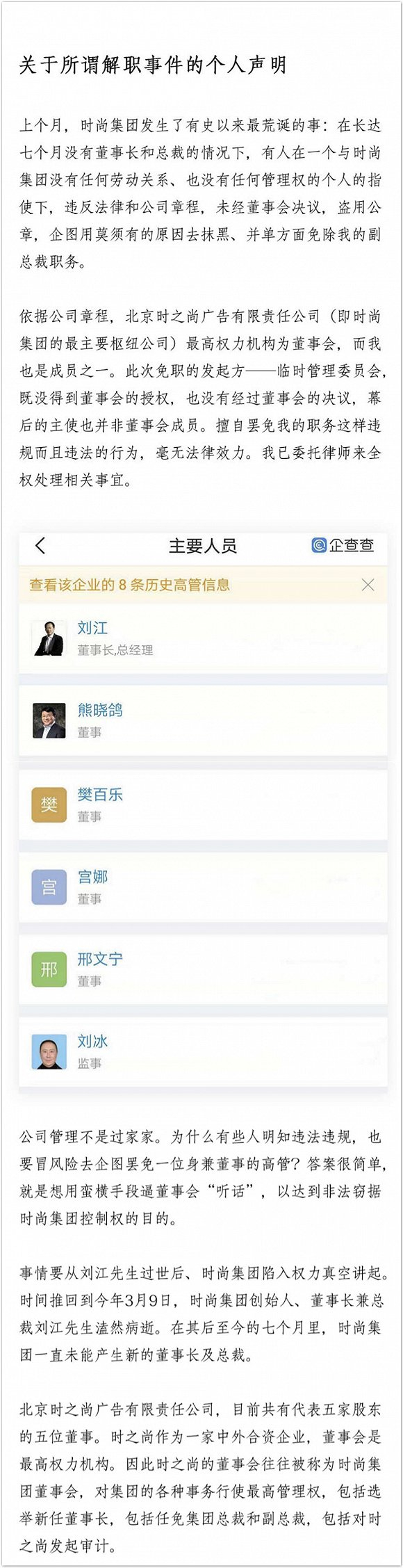 声明表示,自己被免除副总裁职为公司违反法律和公司章程做出的单方面行为,而免除其职务的组织是“一个由若干副总裁组成的所谓临时管理委员会”,该组织在一个与时尚集团没有任何劳动关系、也没有任何管理权的个人的指使下,未经董事会决议,用盗用公章的方式和莫须有的名义免除了其副总裁职务。