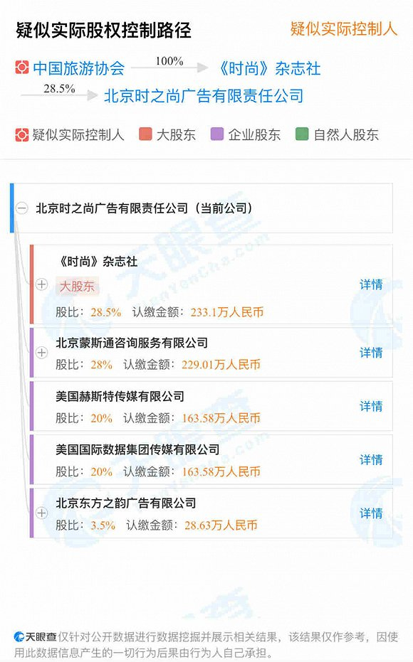 北京时之尚广告有限责任公司系时尚集团主体公司。根据天眼查显示,该公司目前有《时尚》杂志社、北京蒙斯通咨询有限公司、美国赫斯特传媒有限公司、美国国际数据集团传媒有限公司和北京东方之韵广告有限公司5名股东,分别持股28.5%、28%、20%、20%、20%、3.5%。