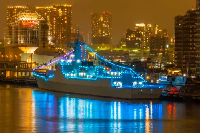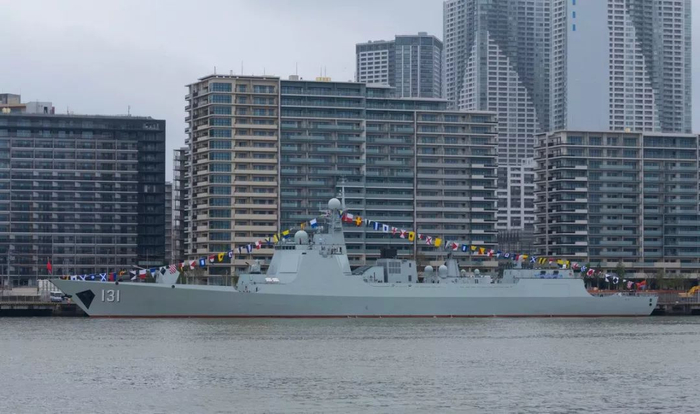 此次日本海上自卫队主办的国际舰队阅舰式虽然未能如期举行,但前来的各国舰艇仍继续开展军事交流活动。太原舰抵达东京晴海码头后,也引起了日本媒体和民众围观。而此时台风“海贝思”仍在日本部分地区肆虐,太原舰官兵也在舰身一侧挂出了双语条幅,上面用中文和日文写着“慰问台风受灾民众,祝愿灾区早日重建”的字样,让不少日本网友向太原舰“道谢”。而在进入港口的夜间,太原舰也开启了全舰灯饰,灯光颜色变幻,展现出了中国战舰钢铁外衣下的温情和关怀。