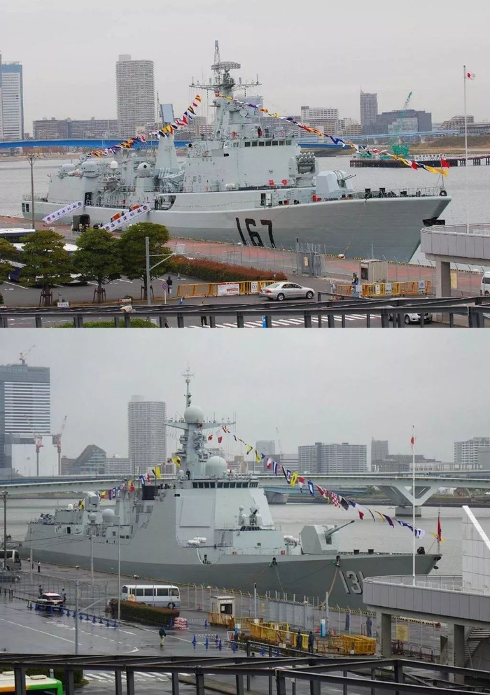 在这张对比照中可以看到,晴海码头的设施以及背景中的建筑物基本没有大的变化,而停靠在同样位置上的中国军舰,已经从051B型驱逐舰深圳舰变成了052D型驱逐舰太原舰。