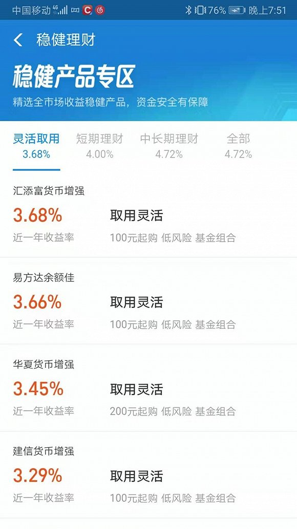 截至发稿,记者打开余额宝页面“稳健理财”栏目,在“取用灵活”类别里可以看见易方达余额佳的身影。但此前的“汇添富添利”消失,变成了“汇添富货币增强”。以上述产品在余额宝平台的变更来看,此次支付宝上线主打“余额佳”概念的理财产品显然不止最初的四款,且在不断进行调整和更替,不排除后续还有更多同类产品上线。