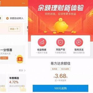 该产品出现在支付宝的“余额宝”页面下方的稳健理财,显示近一年收益率为3.68%。点击进入后显示,该产品全名为“易方达余额佳”,风险等级为“低风险”,100元起购。