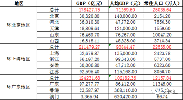 简单从GDP总量来看的话,环北京五个省市,这里存在一个比较主观的区域划分问题,我是把山东和山西这两个省市也加进去了,这五个省市的GDP总量是17.8万亿。环上海地区的话,大概是21万亿的规模。广东大概是12万亿,规模。