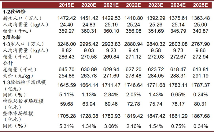 过去20年间婴幼儿配方奶粉行业量价齐升,市场规模由1998年59亿元增至2018年1,619亿元,CAGR达18%,其中销量CAGR达14%,各段奶粉销量CAGR均在10%以上,保持同步高速增长,均价提升约100元/kg,年均提价幅度在4%左右。近五年婴配奶粉人均消费量基数较高,国家对于奶粉价格管控力度加大,新生儿数量减少,整体市场规模增速减慢至个位数水平,行业进入低速发展阶段。我们从新生人口数、人均消费量以及奶粉均价三个维度进行展望与测算,预计2025年1-3段婴配奶粉(不含特殊配方奶粉)市场规模将达到1,780亿元左右,整体市场规模将达到1,870亿元左右,未来5年市场规模的复合增速放慢至1 %。
