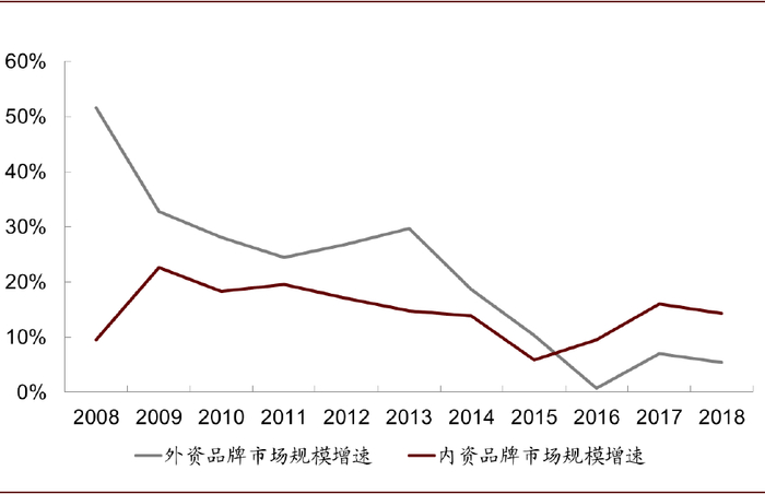 竞争激烈叠加国产品牌失势,行业集中度在2009-2014年间不升反降。近三年受益于奶粉配方注册制新政,集中度逐步提升,2018年尤为明显,CR5提升2.8ppt至45.5%。行业需求乏力背景下,我们判断主打高端品类的行业龙头仍有望进一步透过产品创新、高端化、渠道下沉获取市场份额。在2008年后外资乘食品安全事件东风,凭借品牌认知、电商兴起主导行业发展,2016年起内资品牌重拾增势,受益于独特产品定位、奶粉新政及渠道精耕。考虑低线城市具有更大消费潜力、内资品牌信心复苏,高端化进程不输外资品牌及政策导向利好内资品牌做大做强,我们判断内外资之争未来内资或将更胜一筹,重回市场领导地位。