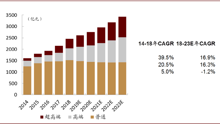 1)价格带间表现分化明显,产品结构持续升级。根据沙利文数据,2014-18年超高端奶粉和高端奶粉市场规模CAGR分别为39.5%、20.5%,远高于行业平均及普通奶粉,超高端和高端奶粉占比由2014年的22%升至2018年的38%,同时沙利文预测未来五年高端及超高端奶粉所占份额将持续提升,至2023年达58%。在结构升级带动下,国内奶粉均价2014-2018年间累计提升10.6%,我们预计超高端和高端奶粉增速有望延续,行业整体ASP或将进一步提升。