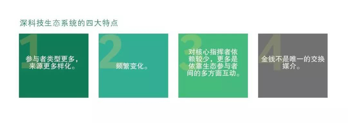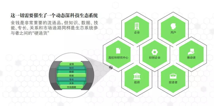 多主体联盟。深科技生态体系包含多种参与者,初创企业能够引领新技术或新产品的研究、开发和商业化;投资者在提供资金的同时,往往还会提供企业发展和市场进入战略方面的专长知识以及高层的人脉关系;企业不仅提供资金和其他必需品,还会提供进入市场和触及潜在客户的通路;高校可以成为重要的研究伙伴,而一些背后的推动者(如初创企业加速器)在帮助初创企业发展各种其他必要关系时,往往发挥关键作用。