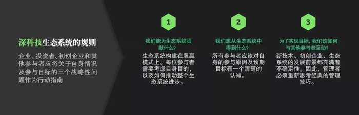 我们正处于深科技生态体系新生范式的早期形成阶段,第一条规则也许就是设定目标,投身游戏之中。唯有如此,才能在实践中学习并汲取失败的经验教训,同时挖掘双赢生态的潜力,在破晓而来的深科技生态中占得先机。