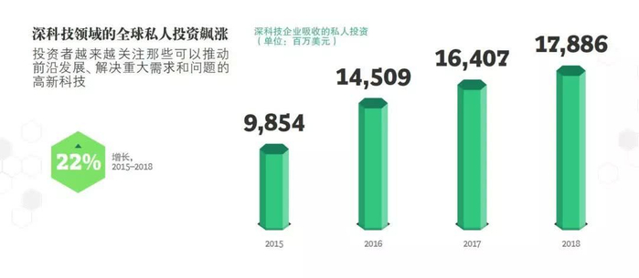 数据显示,2015年到2018年,生物科技、人工智能、高新材料等七类深科技吸收的全球私人投资总额已接近180亿美元,年均飙涨超过20%。但市场风险和技术风险加剧了深科技的投资难度(参阅下图)。