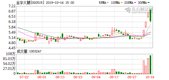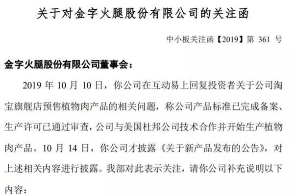 值得注意的是,金字火腿10月11日就出现股价涨停,10月14日早间才披露公司开始生产植物肉产品的利好消息,公司因此受到监管层质疑。