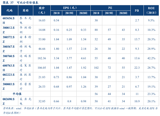 估值分析:公司的主营业务属于光电技术检测设备,可比相关公司为泰禾光电,此外检测及仪器仪表行业相关公司包括华测检测(综合检测服务)、安车检测(机动车检测设备)、精测电子(半导体检测设备)。随着公司逐步被市场定义为医疗检测公司,我们同样加入医疗检测公司迈瑞医疗、通策医疗、鱼跃医疗、乐普医疗作为比较。