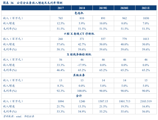 五、盈利预测与估值分析分业务收入预测:1)假设高端医疗影像设备未来三年增速为50%、40%、30%,口腔CBCT相比海外进口设备价格竞争力强劲,公司保持价格不变,毛利率维持自60%的水平;2)假设色选机业务未来三年收入年复合增速为10%、8%、7%,价格不变毛利率保持在为51%、51%、51%;3)假设X射线异物检测机未来三年收入及毛利率不发生显著变化。