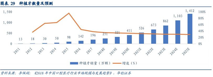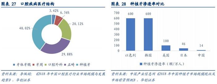 种植牙及正畸市场不断扩大。从我国居民当前的口腔患者治疗结构来看,正畸和种植牙的占比较高,其中正畸人数占比为30%,种植牙的占比为40%。其中正畸服务的价格在2-8万不等,种植牙的费用在几千到上万不等,费用较高。随着消费结构的升级和人均收入的不断增加,除了牙病的治疗,人们更加注重牙齿的美观,选择洁牙、正畸的人会逐渐增多,正畸市场迅速发展;随着老年人对缺牙治疗的意识的不断提升,种植牙市场也将持续扩大。全球范围看,按植牙数量占人口比例,最高的是以色列和韩国,达到600颗/万人,其次是欧洲发达国家和美国,植牙渗透率约为100颗/万人,即使是发达国家中渗透率较低的日本,也有46颗/万人。至2017年底,我国种植牙销量达到196万颗,目前的植牙渗透率仅14颗/万人,远远低于其他国家,主要是受到人均可支配收入以及种植牙昂贵价格的影响。近年来,随着居民消费水平不断提高,种植牙市场也迅速发展。2011-2017年,我国年种牙颗数的复合增长率达到56%,成为全球增长最快的种植牙市场之一。按照美国等发达国家100颗/万人的植牙渗透率计算,我国种植牙数量将达到1400万颗,按照5000元/颗的价格估计,我国种植牙未来的市场空间将达到700亿。预计未来随着医生技能提升及患者治疗意识的增强,种牙渗透率会持续提升,未来几年种植牙市场将保持30%以上的增速。CBCT结合椅旁CAD/CAM系统, 可实现种植治疗的全程数字化, 包括术前诊断、种植手术设计、外科导板、个性化基台以及最终种植修复体的设计制作,基于未来种植牙广阔的市场空间,椅旁设备也会迎来需求的增长。