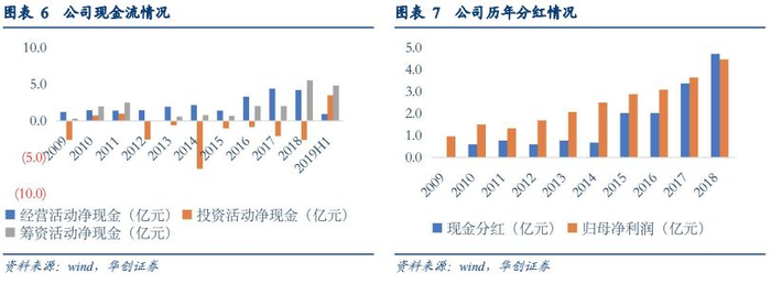公司经营性现金流显现持续增长趋势,2018年及2019年上半年公司经营活动净额分别为4.23、0.91亿元。在经营性现金流状况充裕的情况下,公司现金分红金额持续提升,2016-2018年,公司现金分红分别达到2.03、3.38、4.73亿元,为股东创造了良好的投资回报。