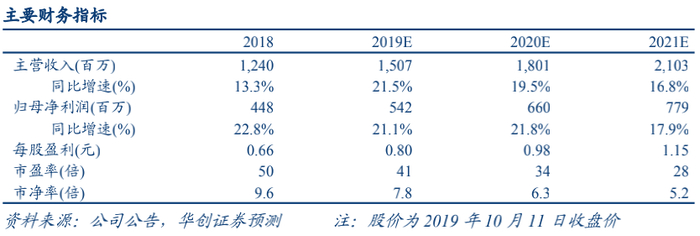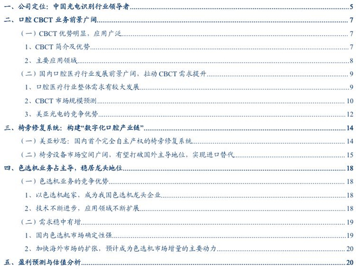 投资要点:中国光电识别行业领导者,业绩增速稳定。美亚光电是一家专业从事光电检测与分级专用设备及其应用软件研发、生产和销售的高新技术企业,主要产品涵盖色选机产品、高端医疗设备以及工业检测设备。公司较早进入我国的光电识别领域,掌握了光电检测与分级流程中所需使用的全部技术,并持续致力于技术的研发与创新,具有较好的持续发展能力,是我国光电识别行业领导者。从财务状况来看,公司业绩增速稳定,公司2018年实现营收12.4亿,同比增长13.33%,5年复合增长率达13.4%;归母净利润4.48亿元,同比增长22.8%。2019年上半年,公司实现营业收入、归母净利润分别为5.88、2.07亿元,同比分别增长19.57%、21.84%。口腔医疗步入新蓝海,拉动CBCT需求提升。我国口腔医疗需求市场空间广阔,口腔患者数量庞大而就诊率低的现状会随着消费升级以及口腔健康意识的提高不断改善,未来就诊人数会有大幅度的增加。口腔医疗行业需求拉动口腔医院的主要驱动因素民营诊所的增加,从而拉动CBCT需求提升。随着民营诊所的增加以及CBCT市场渗透率的提升,未来我国口腔CBCT行业市场空间有望达到150亿元。美亚光电依靠其性价比以及服务上的巨大优势,2019年借助三次行业展会口腔CT销量达到1304台,同比去年实现大幅增长。公司新产品“妙思”椅旁修复系统意在打造“数字化口腔产业链”,市场空间广阔。椅旁修复系统相对于传统取模在节省就诊时间,提高患者的舒适度以及保障修复质量上具有明显优势;椅旁设备与CBCT结合,将实现种植治疗的全程数字化,打造“数字化口腔产业链”。基于我国正畸及种植牙广阔的市场空间以及公司在技术、产业链一体化以及销售渠道上的优势,椅旁设备也望迎来需求的增长。公司“臻彩”口内扫描仪最快有望于2019年底拿到医疗注册资格证,预计于2020年批量投放市场。此外,耳鼻喉及骨科CBCT目前已处于临床和认证阶段,有望成为公司高端医疗影像板块的下一个增长点。盈利预测、估值及投资评级。我们预计公司2019-2021年分别实现营业收入15.07、18.01、21.03亿元,实现归母净利润5.42、6.60、7.79亿元,EPS 0.80、0.98、1.15元,对应PE 41、34、28倍。我们认为随着口腔CBCT收入占比逐步提升,以及椅旁修复系统产品的推出收入占比提升,公司医疗设备属性有望被市场认可,市场前景广阔,产品更新快,盈利能力强的商业模式特征有望使得公司获得更高的估值水平。我们给予公司的合理估值PE 40倍,根据2020年EPS计算,即12个月内目标价39.2元/股,首次覆盖给予“推荐”评级。风险提示:公司口腔CBCT产品推广情况低于预期,新产品椅旁修复系统推进进度低于预期,色选机业务增速下降。